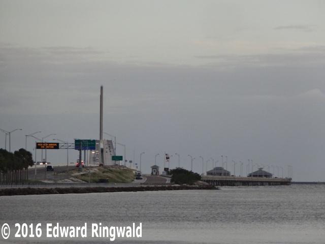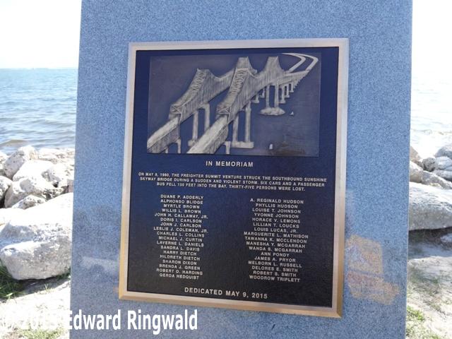 On 9 May 2015 - 35 years to the day the southbound span of the Sunshine Skyway was hit by the Summit Venture causing 1,260 feet of the Sunshine Skyway's southbound span to fall into Tampa Bay taking with it 35 lives - a long awaited and well deserved memorial was erected and dedicated to the 35 people that lost their lives that fateful morning. It is located in the Sunshine Skyway North Rest Area southwest of the rest area building.