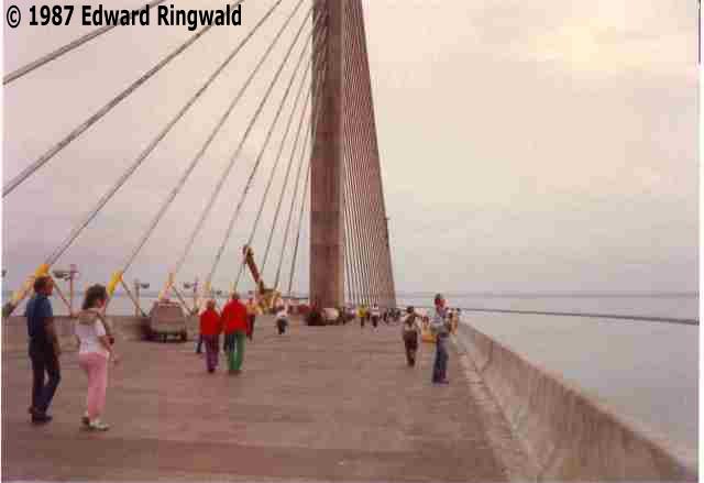 At the Sunshine Skyway's dedication ceremony in February 1987 (the bridge didn't open until April 1987) I took a few pictures with my trusty 35 mm camera; after all, digital cameras were not being made yet! (Or would not be for another 15 years, put it that way). Despite a dreary Saturday in February 1987, thousands of people - me included - came out to walk to the top of the new Sunshine Skyway Bridge, the only time pedestrians were allowed. Speeches by dignitaries including former Florida Governor Bob Graham (of which the Sunshine Skyway was named after in 2005) were made and the event was covered by the Tampa Bay region's news media outlets including WTOG-TV Channel 44, which had their Eyewitness News newscast at the time (unfortunately, Bay News 9 wasn't around yet which would not come on the air for another 10 years).
