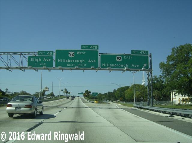 Hillsborough Avenue is a major east-west highway that carries US 92 as well as US 41 just east of the interchange with Interstate 275 for a short segment. The Hillsborough Avenue interchange features a dual eastbound/westbound exit system for northbound Interstate 275 travelers while southbound Interstate 275 travelers have a single exit for both eastbound and westbound Hillsborough Avenue.