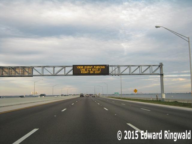 In the 1970’s a stalled vehicle warning system was installed that consisted of a series of push buttons along the length of the center section; when a button was pressed motorists were notified by the flashing sign “stalled vehicle” just before entering the center section. This was later replaced by a more sophisticated accident warning system utilizing overhead lane signals on the bridge and variable message signs at the approaches to the bridge. These variable message signs would have their normal messages but in the event of an accident or other incident that closes the bridge for any reason the messages would be changed by remote radio signal link to advise motorists to follow specially designated signs (these signs were an interstate shield with the legend N or S) that would take one across the Gandy Bridge to avoid the resulting congestion as a result of a temporary closure.