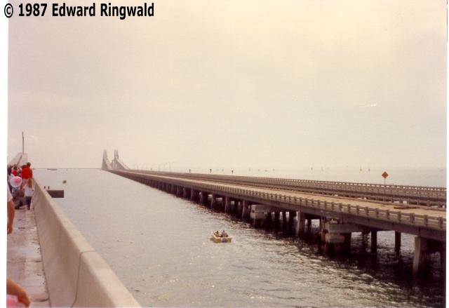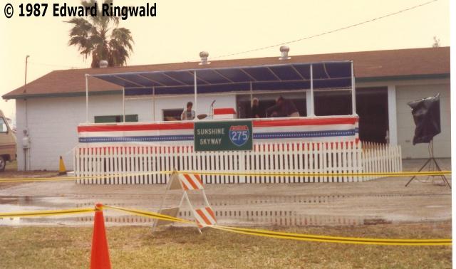 At the Sunshine Skyway's dedication ceremony in February 1987 (the bridge didn't open until April 1987) I took a few pictures with my trusty 35 mm camera; after all, digital cameras were not being made yet! (Or would not be for another 15 years, put it that way). Despite a dreary Saturday in February 1987, thousands of people - me included - came out to walk to the top of the new Sunshine Skyway Bridge, the only time pedestrians were allowed. Speeches by dignitaries including former Florida Governor Bob Graham (of which the Sunshine Skyway was named after in 2005) were made and the event was covered by the Tampa Bay region's news media outlets including WTOG-TV Channel 44, which had their Eyewitness News newscast at the time (unfortunately, Bay News 9 wasn't around yet which would not come on the air for another 10 years).