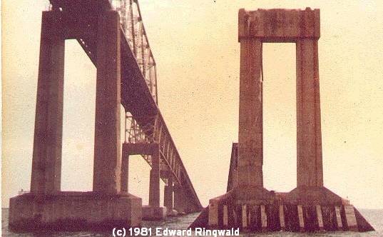 Except for Pier 1-S, the major south channel pier, all the other piers including the north main channel pier, Pier 1-N, were designed and built identical to their 1954 counterparts. In 1981 I took a boat excursion aboard the Steven Thomas from downtown St. Petersburg to the Sunshine Skyway Bridge and I managed to get pictures of the old Sunshine Skyway's channel piers including that of Pier 1-S together with its 1954 counterpart to show you the difference between the original channel piers and the repaired channel pier.